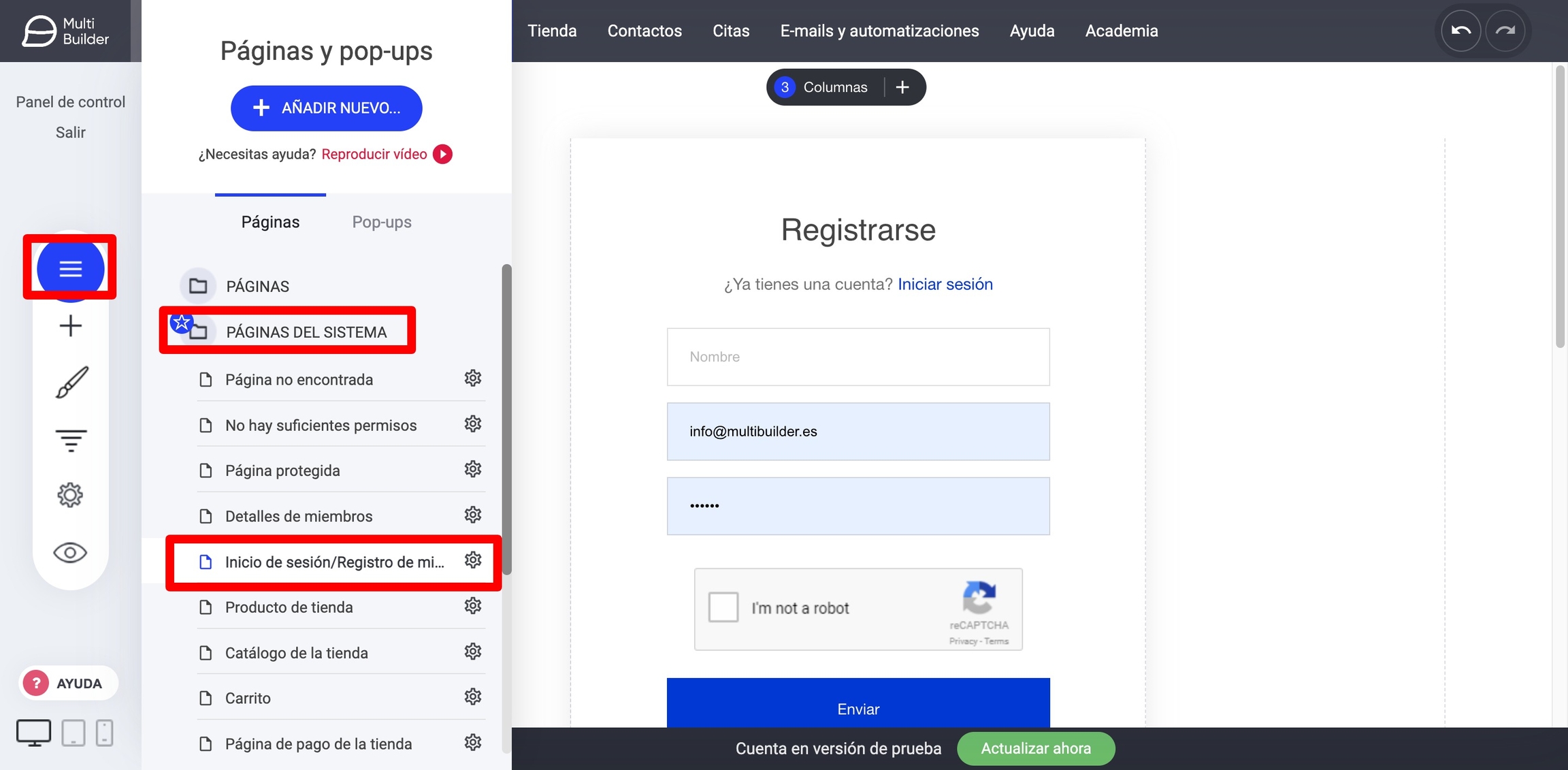En los sitios web (pero no en los embudos) este widget ya lo encontramos por defecto en una página del sistema, si bien el widget es exactamente el mismo. Lo tenemos en Páginas>Páginas del sistema>Inicio de sesión/Registro de miembros. Puedes verlo aquí abajo: