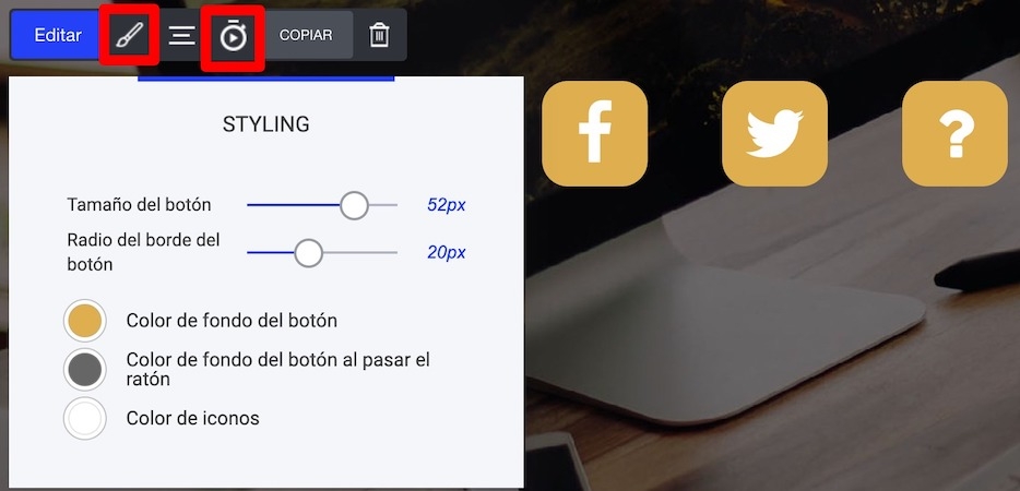 Para cambiar el aspecto de los iconos de las redes sociales, clicamos en el Pincel. Desde aquí modificamos: