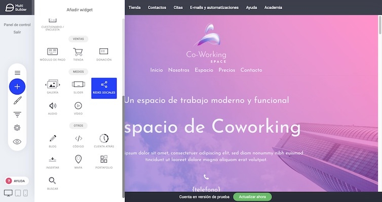 Este widget lo encontramos en la sección de Medios. Con él podemos añadir iconos de redes sociales en cualquier parte de nuestra web.